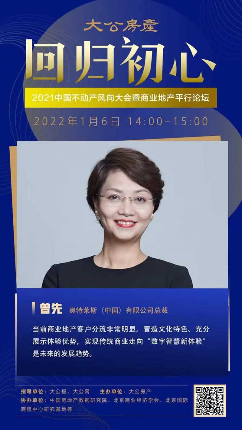 2022年1月6日,由大公網(wǎng)房產(chǎn)頻道聯(lián)合多方機(jī)構(gòu)舉辦的“【回歸初心】——2021中國不動產(chǎn)風(fēng)向大會暨商業(yè)地產(chǎn)平行論壇”線上直播活動正式開始。本期論壇以“回歸初心”為主題,邀請了行業(yè)內(nèi)知名專家、商業(yè)地產(chǎn)企業(yè)領(lǐng)袖等,圍繞行業(yè)周期下的危與機(jī)、新時代下商業(yè)地產(chǎn)的運(yùn)營管理手段、新周期下如何堅守商業(yè)初心等話題展開討論,解析行業(yè)機(jī)遇挑戰(zhàn)及復(fù)蘇破局之道。奧特萊斯(中國)有限公司總裁受邀參加本次活動,并進(jìn)行了精彩的線上直播發(fā)言。