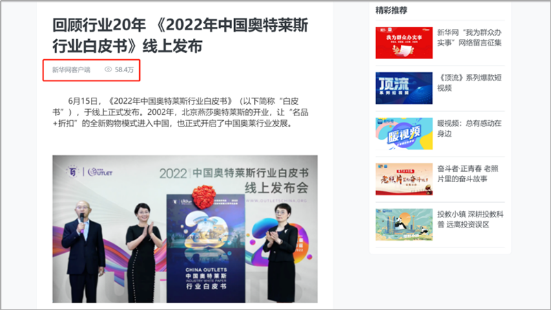 會(huì)后,國(guó)內(nèi)主流權(quán)威媒體紛紛在第一時(shí)間通過(guò)各自官方平臺(tái)及渠道發(fā)布此次活動(dòng)盛況及內(nèi)容。截止6月23日,共計(jì)近百家媒體在全網(wǎng)發(fā)布、轉(zhuǎn)載“2022年中國(guó)奧特萊斯行業(yè)白皮書(shū)線上發(fā)布”相關(guān)報(bào)道及新聞百余次,全網(wǎng)累積點(diǎn)擊閱讀量近五百萬(wàn)次。