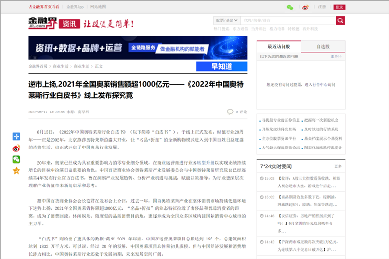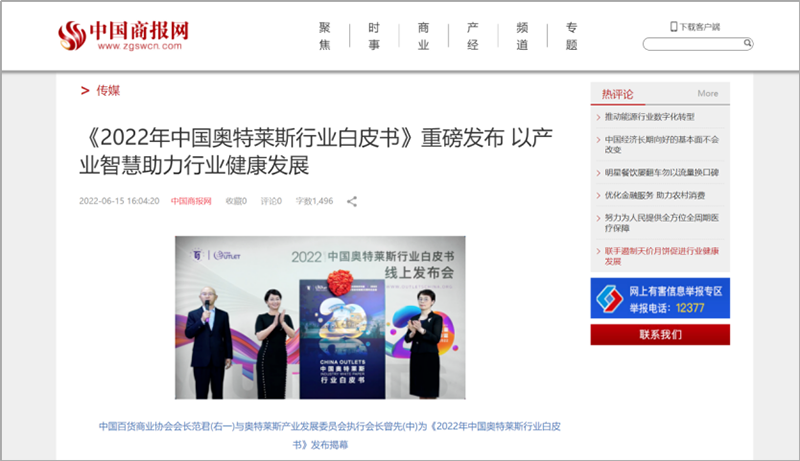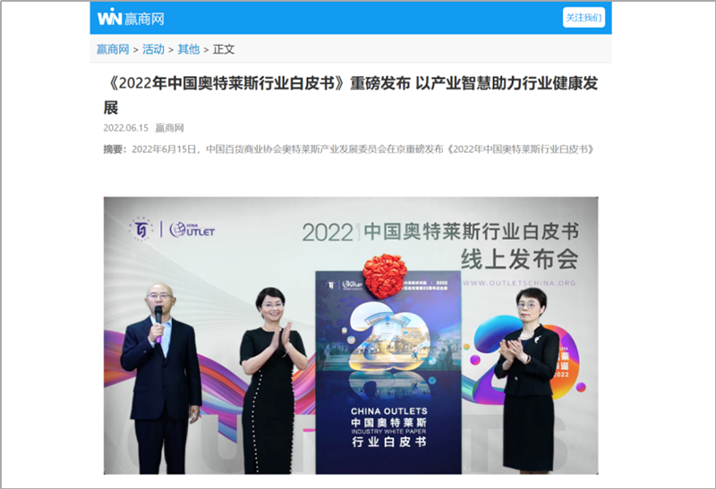 2022年6月15日,中國(guó)百貨商業(yè)協(xié)會(huì)奧特萊斯產(chǎn)業(yè)發(fā)展委員會(huì)線上直播發(fā)布《2022年中國(guó)奧特萊斯行業(yè)白皮書(shū)》。白皮書(shū)中“2021年中國(guó)零售市場(chǎng)最新發(fā)展、中國(guó)奧萊20年全覽、2021年中國(guó)奧萊市場(chǎng)發(fā)展、中國(guó)奧萊展望和政策建議、專家訪談”等內(nèi)容吸引政府領(lǐng)導(dǎo)、專業(yè)機(jī)構(gòu)、產(chǎn)業(yè)運(yùn)營(yíng)商、品牌商、服務(wù)商、媒體記者及眾多奧萊消費(fèi)者共計(jì)20余萬(wàn)人參會(huì),成為國(guó)內(nèi)奧萊行業(yè)年度一大焦點(diǎn)。