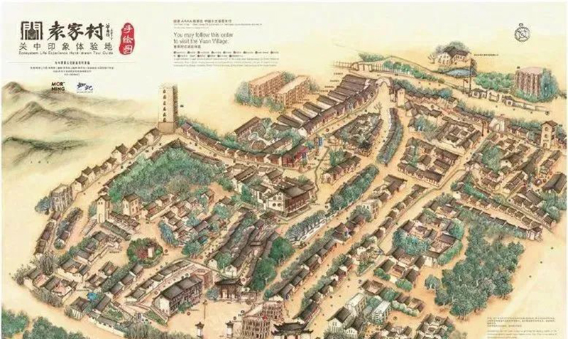 國內(nèi)知名鄉(xiāng)村旅游地——“袁家村”手繪圖