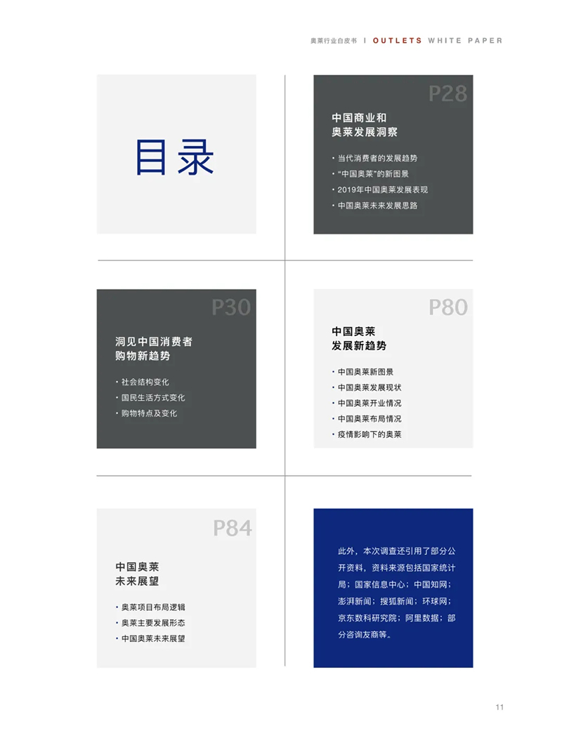 為了及時總結(jié)中國奧萊的發(fā)展?fàn)顩r和運營經(jīng)驗,引導(dǎo)中國奧特萊斯產(chǎn)業(yè)在后疫情時代的健康、快速發(fā)展,我們組織編寫了這部《2020中國奧特萊斯行業(yè)白皮書》。我們基于對后疫情時代中國經(jīng)濟的內(nèi)生動力,以及中國消費格局、消費趨勢新變化的深?分析,并通過線上問卷調(diào)查與線下深度訪談相結(jié)合的方式,客觀分析了中國奧特萊斯的發(fā)展表現(xiàn),綜合闡述了中國奧特萊斯的未來發(fā)展思路。