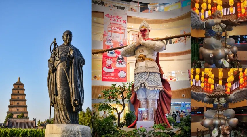 以西安大悅城為例,他深挖大唐、長安歷史文化底蘊,與在地城市地標形成呼應,中庭悟空與大雁塔玄奘雕像隔街對望,并打造契合潮流時尚客群訴求的“勿空”美食街區(qū)與“不戒食巷”,街區(qū)內(nèi)的墻體上還有師徒四人取經(jīng)歸來的立體壁畫,讓原本只以美陳形式存在的孫悟空、豬八戒變成文化傳播的紐帶。